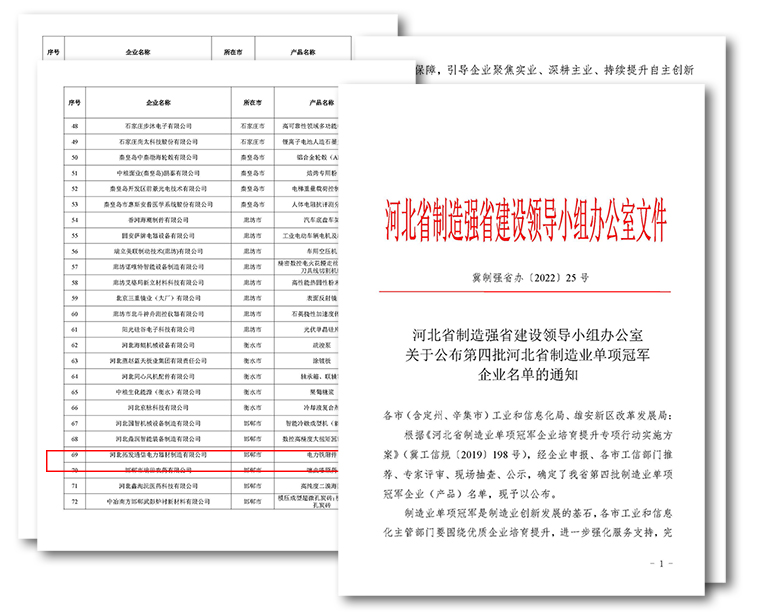 12月30日,據(jù)《河北省制造強(qiáng)省建設(shè)領(lǐng)導(dǎo)小組文件》冀制強(qiáng)省辦〔2022〕25 號(hào)文件,河北省制造強(qiáng)省建設(shè)領(lǐng)導(dǎo)小組辦公室關(guān)于公布第四批河北省制造業(yè)單項(xiàng)冠軍企業(yè)名單的通知: